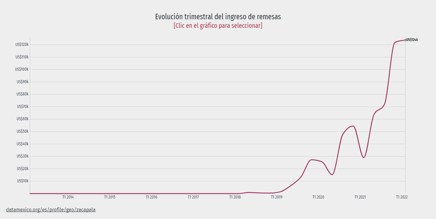 El gráfico de línea muestra la evolución trimestral del ingreso por remesas. En el primer trimestre de 2022, Zacapala registró un monto de remesas de US$124k.