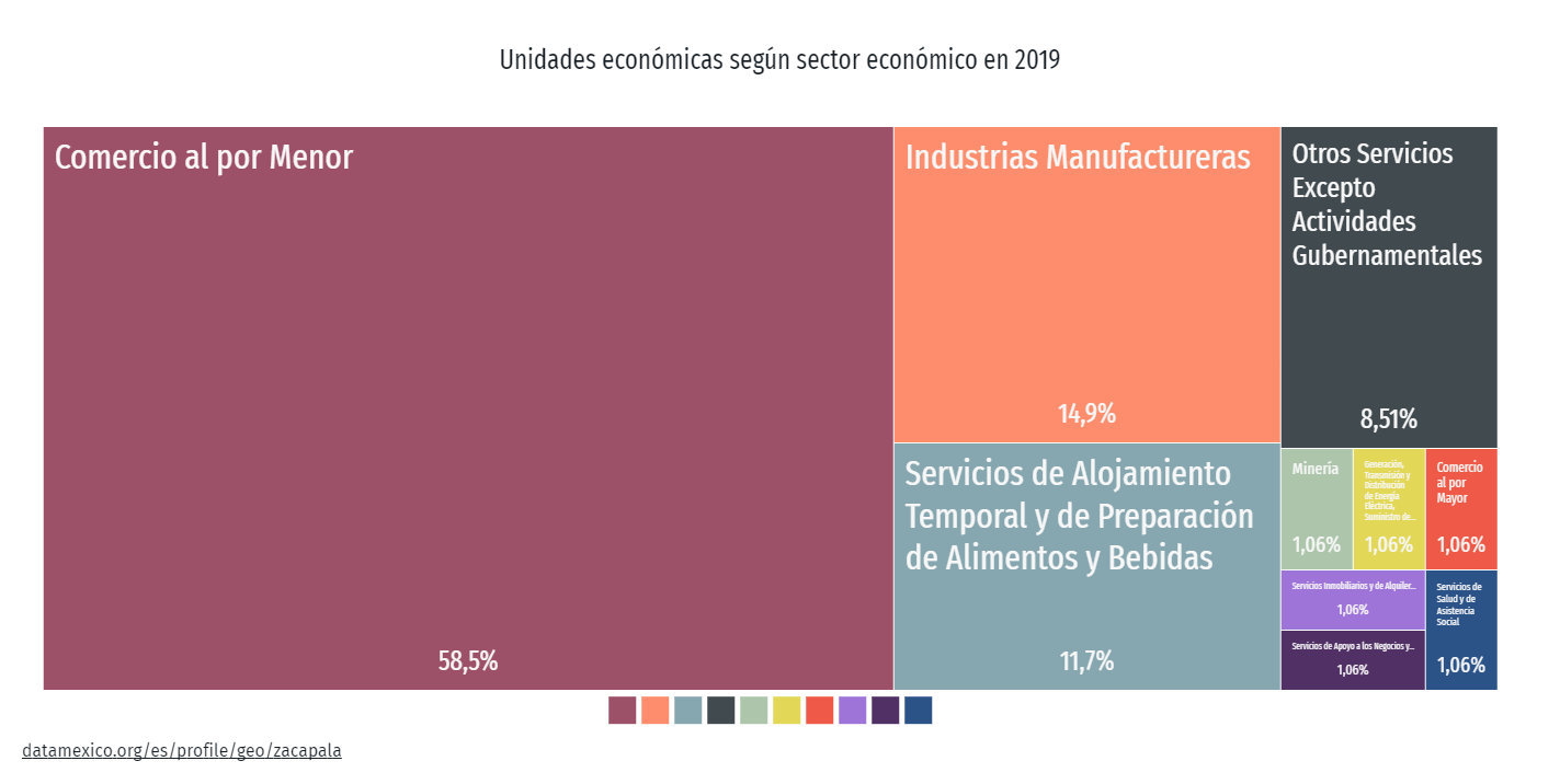 Según datos del Censo Económico 2019, los sectores económicos que concentraron más unidades económicas en Zacapala fueron Comercio al por Menor (55 unidades), Industrias Manufactureras (14 unidades) y Servicios de Alojamiento Temporal y de Preparación de Alimentos y Bebidas (11 unidades).